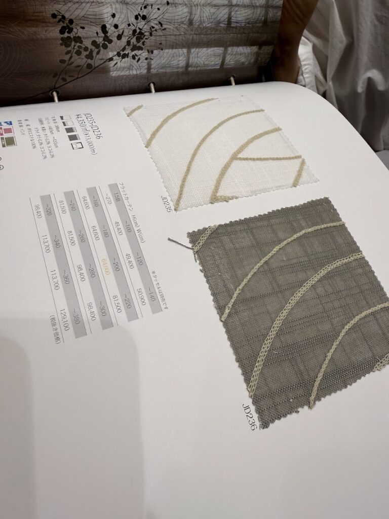 今回は独自で開発されたカーテン見本帳「Eco de Happness」(エコハピ)と「PREMIUM」(プレミアム)の商品説明をしていただきました。