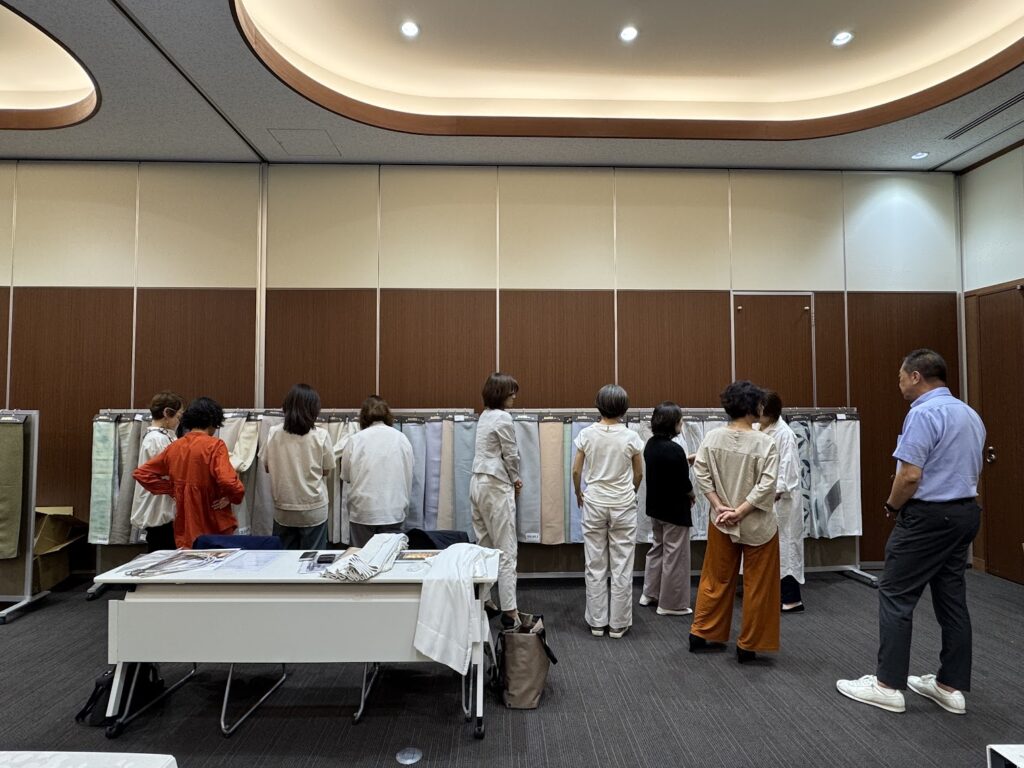 まだ見本帳に掲載されていない新生地なども実際に見たり手に触れたりしながら、会員は興味深くお聞きすることができました。